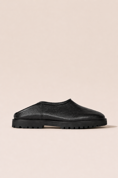 Este zueco está construido en cuero natural de grano marcado, con una silueta limpia que envuelve el pie en un solo gesto. La ausencia de herrajes y costuras visibles refuerza su carácter directo: un volumen simple que descansa sobre una base firme.